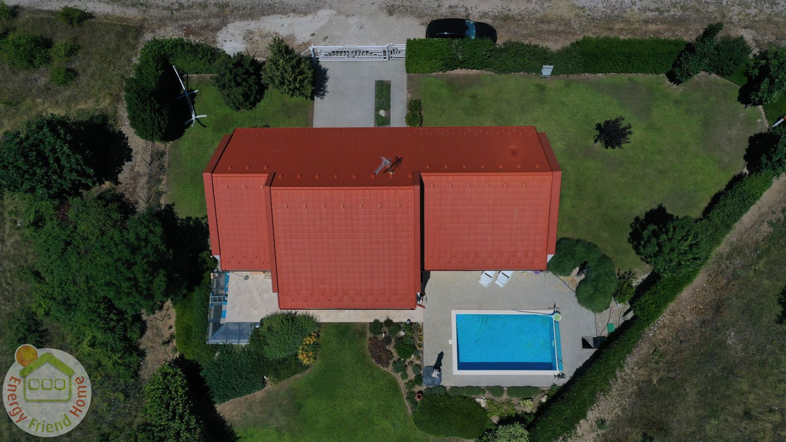 Acélszerkezetes családi készházunk felülnézetből. Terrán síkcseréppel fedve.