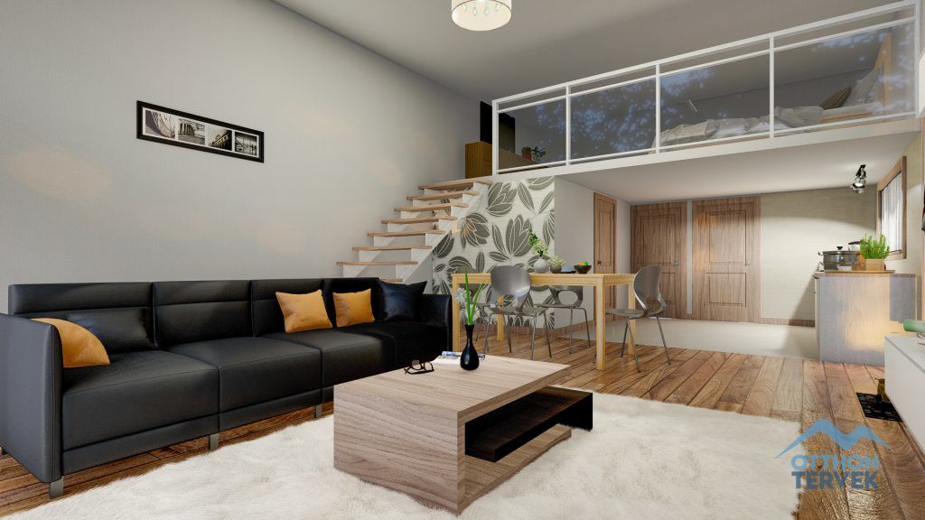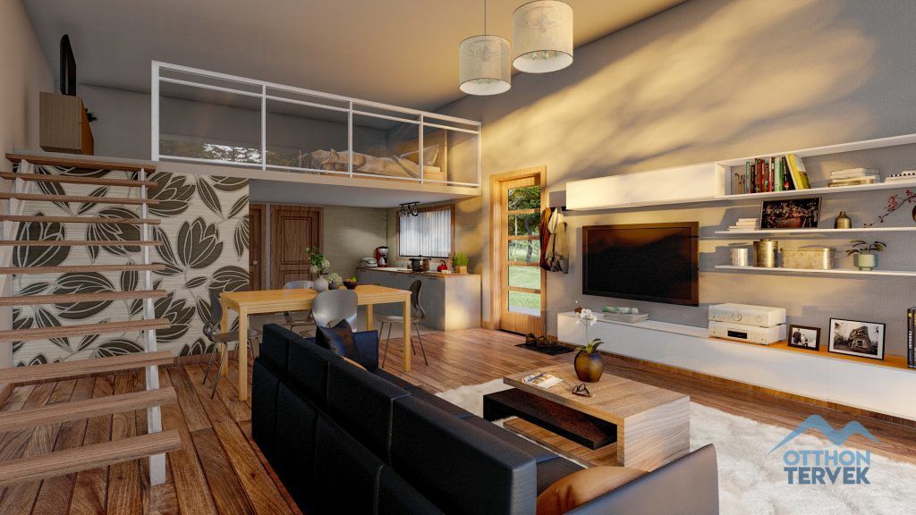 Nagy nappali, egy nagy és egy kis szoba, konyha-étkező található a moduláris házunkban, a nappali felett egy galériát is kialakítottunk, mely alkalmas akár 2-3 személy részére vendégszobaként funkcionálni alvás céljára.